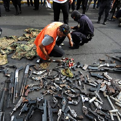 Two stories of lives blighted by the rule of the gun - at war and during a supposed peace. In Honduras and El Salvador, Will Grant finds ample evidence that gun ownership, private security forces and rates of violence are all rocketing in Central America. In some places there are more privately-employed armed guards than state police forces; in others, innovative ideas to "increase the peace" are beginning to lose their shine as gang-related homicides creep back to earlier levels. In a town straddling the Turkish/Syrian border, Akcakale / Tel Abyad, Hannah Lucinda Smith meets refugees from the Syrian conflict who are now trapped in Turkey - yet metres from home. There's a long history of crossing the border to trade and work - but now these families can only look on helplessly as battle rages in their former homes. Presenter: Pascale Harter. Produer: Polly Hope. Photo: Police check weapons during a ceremony to surrender arms in donwntown San Salvador, on May 27, 2013. Jose CABEZAS/AFP/Getty Images