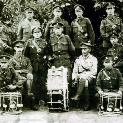 St Columb's Cathedral in Londonderry is a popular place of worship. It is also home to some historic military regalia, including a remarkable bass drum. This drum was carried to the Somme in France, the scene of one of the most famous battles of the Great War, by members of the Hamilton Flute Band. Band members are believed to have enlisted en masse when war broke out. They became the regimental band of the 10th Battalion, The Royal Inniskilling Fusiliers. Their flutes and drums accompanied the soldiers as they marched hundreds of miles - first to their training camps and then to the Western Front. When the 'Derrys', as they were known, went to France the band members became stretcher bearers. They witnessed the full horror of war at the Battle of the Somme, and their bass drum and side drums were used as a communion altar. The term 'drumhead service' has its origins in this practice. 66 members of the band lost their lives in the course of the war. The survivors returned home with the bass drum, and in the 1970s the band donated their full set of drums to St Columb's Cathedral where they are on display in the Chapterhouse. In 1996 the Hamilton Flute Band returned to France to play at the commemoration of the 80th anniversary of the Battle of the Somme. They brought the old bass drum, and it served as a communion altar once more during a service at the Ulster Tower. The band, and the drum, may return to the Somme in 2016 to mark the centenary of that historic battle. Cathedral historian Ian Bartlett and two band members recount the drum's story. Location: St. Columb's Cathedral, Derry, BT48 6RQ Image of the Hamilton Flute Band serving as the 10th Battalion Service Band of the Royal Inniskilling Fusiliers in France, circa 1915 Photograph courtesy of the Hamilton Flute Band, Londonderry