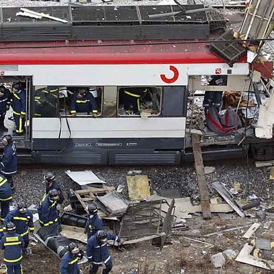 On 11 March 2004 bombs exploded on early-morning commuter trains in the Spanish capital, killing almost 200 people. Another 1,800 people were injured. Three days later, Spain held general elections, in which the ruling Popular Party suffered a surprising defeat. Witness hears from two Spanish politicians. (Photo: Wreckage of a Spanish train and emergency service teams. Credit: Pierre-Philippe Marcou/AFP/Getty Images)