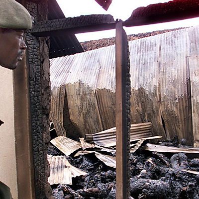 ***Some listeners may find parts of this programme disturbing.*** In March 2000, hundreds of doomsday cult members burned to death in a fire in south western Uganda. Initially the authorities believed it was mass suicide, until a series of grisly discoveries convinced police they were dealing with mass murder. Photo: A soldier views the remains of the church in Kanungu which belonged to the Movement for the Restoration of the Ten Commandments of God, Credit: AFP/Getty images