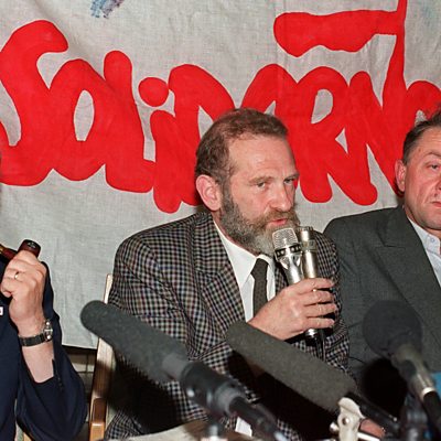 In April 1989 the Polish trade union Solidarity was legalised once again, after eight years operating underground. It was a key step towards Solidarity’s defeat of the Moscow-backed communist authorities at elections later that year. Witness hears from Solidarity's former spokesman, Janusz Onyszkiewicz. Photo: Polish Solidarity spokesmen Janusz Onyszkiewicz (L) and Jozef Slisz (R) look on as advisor Bronislaw Geremek calls for the legalisation of independent political parties on 6 June, 1989. (Credit: Getty Images)