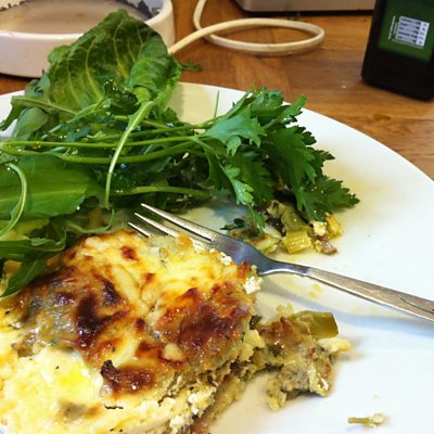 Wild Garlic is wonderful at this time of year, use it in place of spring onions, or make a pesto with cheddar, walnuts and rapeseed oil. Pancakes 50g butter 2 eggs 200ml milk Salt and Pepper and a grating of fresh nutmeg 100g plain flour A bunch of wild garlic or a bunch of spring onions finely chopped (use 1 tablespoon and reserve the rest for the filling) A bunch of parsley finely chopped (use 1 tablespoon and reserve the rest for the filling) Olive oil Filling Oill and butter 250g Chestnut or button mushrooms finely sliced The reserved wild garlic and parsley as above 50g cheddar cheese (or your favourite cheese) Cream Sauce 400ml Single Cream freshly grated nutmeg salt and pepper 50g grated cheddar Firstly, brown the butter in a large frying pan, put to one side. Mix the eggs, milk, salt, pepper, nutmeg and flour together very vigorously with a balloon whisk or electric whisk, beating out any stubborn lumps. Add a tablespoon each of chopped wild garlic and chopped parsley, mix well. Heat a little butter and oil in a large frying pan and pour enough mixture in to coat the pan, cook for a minute or so until brown on one side, then flip over and cook the other side. Place the pancake to one side on a large plate. Repeat until all the mixture is used. To make the filling, heat the oil and butter in a small frying pan or saucepan, add the mushrooms, salt and pepper and gently cook until tender. Remove from the heat, add the wild garlic, parsley and cheese and mix. Butter a large deep sided oven dish (or two small ones). Divide the mixture between the pancakes, place a little filling in the middle of each pancake and fold the pancake over the filling, place in the buttered dish and arrange them overlapping. Heat the cream, nutmeg, salt, pepper and cheddar gently (the cheese does not have to melt completely), pour over the pancakes, sprinkle with a little grated cheese and bake in a hot oven for about 20 to 30 minutes until golden brown on top. Serve with a crisp green salad.