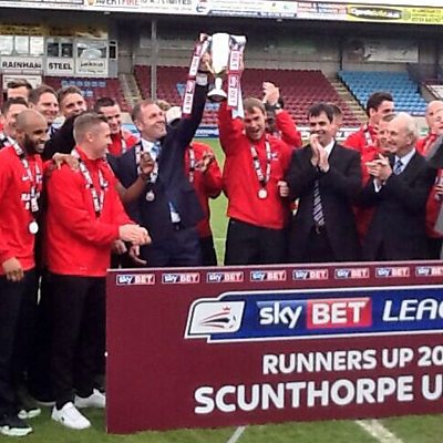 Scunthorpe United players celebrate League Two promotion on an open top bus tour.