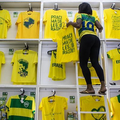 A panorama of stories from a global giant: an edition devoted entirely to Brazil as it prepares to host the World Cup. Pascale Harter introduces dispatches from all around this vast country, looking at some of its greatest dilemmas and its most cherished national myths. Candace Piette warns that behind the verve and energy of Brazilian culture there lies a public who're growing tired of the disrespect and disregard they feel from the elite; Miles Warde wonders about lasting racial pride and racial prejudices in the last country in the Americas to abolish slavery; and Linda Pressly meets people suffering, and benefiting, from modern-day slavery in rural Acailandia. Sue Branford visits the Munduruku (indigenous) communities protesting against plans to flood their part of the Amazon with a new network of hydroelectric power plants, while Justin Rowlatt sees an entirely different dynamic at play in Awa territory, where the Brazilian state is moving ranchers and loggers OFF indigenous lands to protect the Awa. And Kirsty Lang meets the "snake man of Bahia": devoted naturalist Rodrigo Souza, fierce defender of all things fanged and scaly. Producer: Polly Hope PHOTO: A saleswoman arranges T-shirts designed for Brazilian fans of the FIFA World Cup 2014 at a store in Rio de Janeiro (YASUYOSHI CHIBA/AFP/Getty Images)