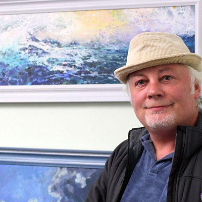 Janet Davies a Meirion Jones yn trafod arddangosfa o waith Meirion a'i dad Aneurin Jones.