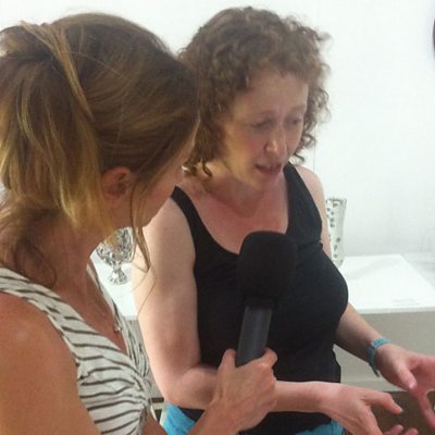 Y crochenydd Lowri Davies yn trafod arddangosfa newydd yng Nghrochendy Nantgarw.