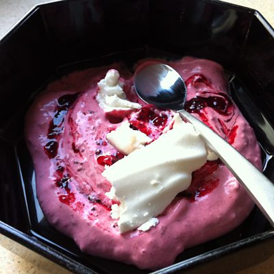 Ingredients • 8 – 9oz icing sugar • 4 egg whites • Vanilla essence(1/2 tsp for meringue and ½ tsp to add to double cream • 450g mixed berries (fresh or frozen) • 4 tbsp caster sugar • 284ml carton of double cream Method 1. Starting with the meringue, whisk the egg whites until light and fluffy. 2. Whisk in the icing sugar a little at a time and add ½ a tsp of vanilla essence. 3. Spoon the mixture onto a lined, greaseproof baking tin and spread out gently into a thin layer. 4. Set oven onto a low heat (gas mark 1-2) and dry the meringue at the bottom of the oven for about 45 minutes. Length of time may need to be adjusted so if the meringue needs more time, check it regularly so that it does not brown. 5. Once firm remove from oven and leave to cool. 6. Next, place the mixed berries and caster sugar into a food processor and blend until smooth. 7. Tip the cream into a bowl, add the remaining vanilla essence, half the berry puree and approximately 60g of crushed meringue. 8. Stir together and refrigerate the mixture for about 10 minutes. 9. Tip the ice cream mixture into the ice cream maker, drizzling in the remaining mixed berry puree towards the end of the process to form ripples.