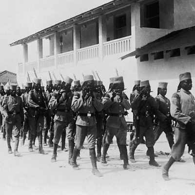 At the start of World War One, British and German colonial forces went into battle in East Africa. Tens of thousands of African troops and up to a million porters were conscripted to fight and keep the armies supplied. We hear very rare recordings of Kenyan veterans of the King's African Rifles, talking about their experiences of the war. The interviews were made in Kenya in the early 1980s by Gerald Rilling with the help of Paul Kiamba. Photo: Locally recruited troops under German command in Dar Es Salaam, Tanzania (then part of German East Africa), circa 1914. (Photo by Hulton Archive/Getty Images)