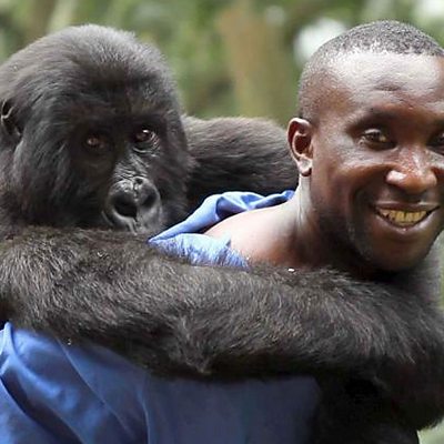 Andre Bauma is a ranger at the Virunga National Park in the DRC, home to the critically endangered mountain gorilla. When poachers target the mother gorillas, Andre adopts the babies. Picture: Andre Bauma witha baby gorilla on his back
