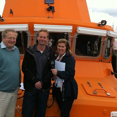 Shelley Jory-Leigh jumps on board the RNLI lifeboat in Yarmouth meeting Jeremy Willcock and coxwain Howard Lester.