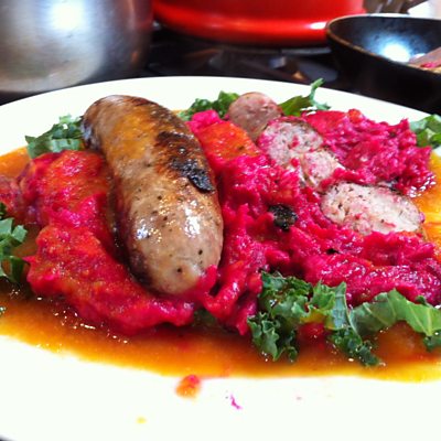 A lovely Spooky dish perfect for a Halloween or Bonfire supper. Serves 2 You will need: 6 Good quality sausages 3 Large Potatoes peeled and cut into even sized chunks 1 large beetroot boiled and skinned 30g butter 2 tablespoons of double cream For the gravy you will need 100g pumpkin flesh 2 large plums Salt and pepper A couple of measures of port First, get the sausages cooking. Place them into a hot frying pan with a dash of oil, brown them on all sides, then turn the heat down low and gently cook for 30 to 40 minutes, turning frequently. Do not pierce the skin as this lets out all the lovely juices. Meanwhile, put the potato chunks into cold water and bring to the boil, simmer gently until cooked through. Have the butter and cream ready in a small saucepan, melt gently and put to one side. Place the pumpkin flesh and plum into a saucepan, just cover with water, simmer gently and pass through a sieve, add the port, salt and pepper and put to one side. When the potato is cooked, drain thoroughly, mash and add the melted butter and milk, salt and pepper. Add the finely grated beetroot and mix thoroughly. Arrange the monster mash in the center of a warmed plate, place the sausages on top of the mash, pour the gravy on and around the mash and serve spookily! Gently steamed kale. runner beans or brussell sprouts would all go well with this. Happy Monster Mash Halloween!