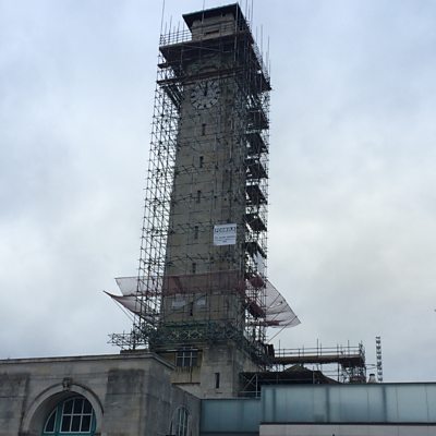 The 155 foot clock tower in the centre of Southampton is part of the civic centre and was damaged in the storms of 2013. The repair works are due to carry on into 2015. BBC Radio Solent's reporter Neil Sackley climbed the 215 steps inside the tower to discover what works are being carried out.