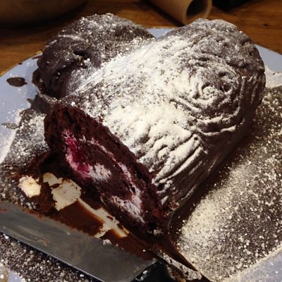 To Make the Sponge 6 eggs separated 150g caster sugar 50g cocoa powder Pre-heat the oven to 180c, gas 4. Line and oil a 30 x 20 x 2.5cm baking tin with baking parchment. Whisk the egg whites until you can make shapes with them. In another bowl, whisk the sugar and the egg yolks together until they start to turn pale and thicken slightly. Add the cocoa powder to the egg yolk mixture and stir with the mixer beaters a little, then whisk thoroughly. Now firmly fold in one third of the egg whites to eh yolk mix, then another third and then the last third, mixing and folding in a figure of eight until thoroughly combined. Pour evenly into the lined tin and bake for 20 to 25 minutes. Take out of the oven, leave to cool, then have another sheet of baking parchment lining ready, flip the sponge out upside down onto it and gently peel off the original parchment. Cut in half from the longer side across, freeze one half and make up the other half to serve about 12 people. To make the filling 250ml double cream whipped to soft peaks 1-2 measures of chocolate liqueur 1 handful of frozen raspberries Mix the cream and liqueur together, whisk slightly to make it thick enough to spread, being careful not to over mix, spread onto the sponge evenly, take the raspberries out of the freezer and crumble them over the cream. Take hold of the baking parchment underneath the cake, nearest to you, and use it to start to squidge the end of the sponge into the cream. Now, holding and pulling the parchment away from you, help the sponge along rolling it firmly away from you. Finish by holding the rolled sponge firmly with both hands and lifting it onto a plate. At this stage, you can just sprinkle with icing sugar, or you can cover the cake to decorate. To decorate the chocolate log Melt 250g dark chocolate with 225ml double cream gently, do not boil. Mix well together and leave to cool. When cool, coat the chocolate log and score with a fork to make it look like a log. You can cut a bit off the end at an angle and attach it to the side to look like a branch. Now sprinkle with icing sugar snow, leave in the fridge to set. Serve with pouring cream or ice cream. For children, you could leave out the liqueur or do half and half. Instead you could drizzle some of the cooled filling onto the cream for a ripple effect.
