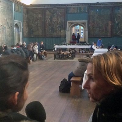 Nia Roberts yn sgwrsio efo Eleri Lynn a Branwen Roberts, am eu gwaith yn gofalu am y casgliad gwisgoedd a thecstiliau brenhinol ym Mhalas Hampton Court.