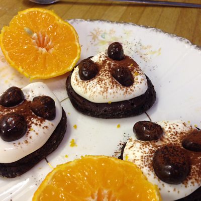 Chocolate Blinis with Crème Fraiche and Cranberries Ingredients 100g self raising flour 1 teaspoon baking powder 3 tablespoons cater sugar 4 tablespoons cocoa powder 1 large egg 150 ml milk Unsalted butter for frying Zest of 1 orange/2 x clementines 1. Sift the flour, baking powder and cocoa into a large blow, add the sugar. Make a well in the centre and drop in the egg. Beat the egg into the flour and add the milk in stages to make a smooth batter which should be the consistency of thick pouring cream. You can always add a little extra milk if the mix is too stodgy. 2. Take care not to over mix or the scones can be tough. 3. Stir in the grated orange zest. 4. Melt a knob of butter in a frying pan and wait until the butter sizzles. Pour a spoonful of batter into the pan for each pancake. Leave plenty of space between them so they don’t merge together. Lower the heat to ensure they don’t burn. 5. Cook gently until a few bubbles appear on the surface and burst and then flip them over and cook for about a minute. 6. Serve warm with any of the following toppings: • Crème fraiche, chocolate coated cranberries and/or crushed pistachios. • Chocolate/hazelnut spread and a good dollop of cream. • Unsalted butter, pan glazed apples and a sprinkle of sugar and cinnamon. • Or try any other combo of sweet treats that take your fancy!