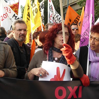 The cleaners whose protest has captured the imagination of those opposed to the harsh austerity programme in Greece. Mostly middle-aged or nearing retirement, they have refused to go quietly. The women have kept up a day and night vigil outside the Finance Ministry in Athens, taken the government to court and resisted attempts by the riot police to remove them by force. They have challenged representatives from the International Monetary Fund and raised their red rubber gloves in a clenched fist at the European Parliament. Some say they represent the plight of many women and the poorly paid, others that they are being manipulated by the left. Maria Margaronis hears the women's stories and asks what makes them so determined. Produced by Mark Savage. (Photo: Cleaning ladies from Greece’s Finance Ministry, taking their protest onto the streets. Credit: BBC)