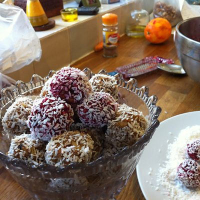 Fruity Energy Bites These are a fantastic alternative to chocolate bars, biscuits and snacks and will give you sustained energy, unlike sugar which gives you a boost and then a dive! Put them in your lunch box, enjoy with a glass of milk or a cup of coffee and feel energised! 6 stoned dates (about 50g) soaked in boiling water for about ten minutes, drained, then finely chopped 50g dried ready to eat apricots finely chopped 25g desiccated coconut 100g walnuts chopped very finely chopped, or bashed with a rolling pin inside a sturdy plastic bag half a banana mashed with a fork 1 tablespoon honey 1 dessertspoon peanut butter 1 small carrot very finely grated 1 teaspoon cinnamon grated rind of one orange 200g desiccated coconut to coat the finished bites Place all the ingredients except for the extra desiccated coconut into a bowl and mix thoroughly. Take about a teaspoon of the mixture, enough to make a bite sized ball, roll in the palms of your hands. Put the extra desiccated coconut onto a large plate and coat the energy bites by rolling them around. Place in the fridge overnight or eat some straight away. The flavours will develop if left. Alternatives: Use a small finely grated raw beetroot instead of a carrot and make red energy bites, they will give you a real boost! Instead of nuts, oats or finely chopped sunflower and pumpkin seeds can be used.