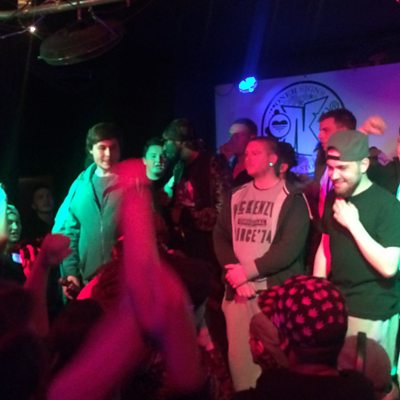 Gwyn yn dal fyny hefo trefnwyr y noson, Mr Phormula, a "Chubbs" - un o'r cystadleuwyr.