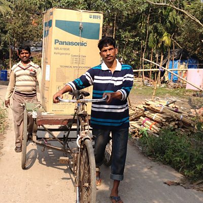 In India, fridges are the second most-desired household object after a television. Only one-third of the population own one, but that proportion's rising fast. Our correspondent Sanjoy Majumder travelled to the Indian state of West Bengal to meet a tailor who's just bought his very first fridge.