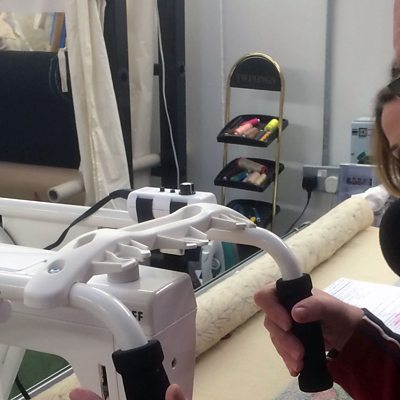 Nia yn sgwrsio efo'r gwehydd Cefyn Burgess yn ei stiwdio.