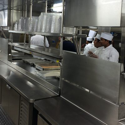 Neil Sackley chats to a chef inside one of Britannia's huge galleys.