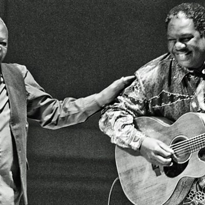 The South African singer-songwriter Vusi Mahlasela celebrates 20 years of freedom. Photo: Hugh Masekela and Vusi Mahlasela on stage at Carnegie Hall in New York. Credit: Dana Distortion Yavin Photography)