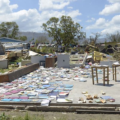 Cyclone Pam brought winds of 300 kilometers per hour to the archipelago devastating homes, leaving at least 24 people dead and over three thousand displaced. Australian tourist, Andrew Brooks was on the remote island of Tanna when the disaster hit. Comedian, Trevor Noah is is a huge star in his native South Africa and is now finding fame on a global scale. He's just joined the cast of the successful American TV programme, The Daily Show with Jon Stewart. Trevor grew up in Soweto, the son of a black South African woman and a white father from Switzerland. Our reporter Matt Nelson went to meet Trevor in a Manhattan bar, as he took a break from another run of sold-out shows in North America. Chu Enoki is one of Japan's most famous and influential artists, best known for his striking sculptural works made with de-activated guns and cannons. They say they're the first British female Muslim Hip Hop duo: Muneera Rashid and Sukina Abdul Noor are converts to Islam who use their music to spread a message of peace, unity and interfaith relations. Catherine Kenrick's runs Parque Andino Juncal - a 14,000 hectare nature reserve high up in the Chilean Andes. Visitors flock there to see the many glaciers that are dotted among the mountains. (Photo: books dry in the remains of a school in Port Vila, Vanuatu hit by Tropical Cyclone Pam. Credit: Fred Payet/AFP/Getty Images)
