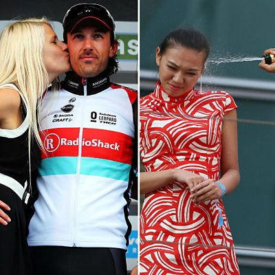 Last week in celebrating winning the Chinese Grand Prix Lewis Hamilton sprayed champagne liberally on the winner's podium and in the process directly in the face of one of the podium hostesses. It thrust Liu Siying, who says she wasn't offended, into a media storm. So what is that like? We speak to Maja Leye who in 2013 had her bottom pinched by cyclist Peter Sagan whilst presenting flowers to the winner of the Tour of Flanders. She explained to the BBC's Caroline Barker how that event changed her life and what she made of the incident in the Chinese Grand Prix. Maja's also explains about her role, which unusually for a podium hostess, includes being part of the organising committee of cycling "Spring Classics" Photo: (L) Race winner Fabian Cancellara stands on top of the podium as Peter Sagan pinches the bottom of podium hostess Maja Leye on the 97th Tour of Flanders March 2013 (Credit: Bryn Lennon/Getty Images) Photo (R) Race winner Lewis Hamilton celebrates on the podium during the Formula One Grand Prix of China April 12 2015 (Credit: Clive Mason/Getty Images)