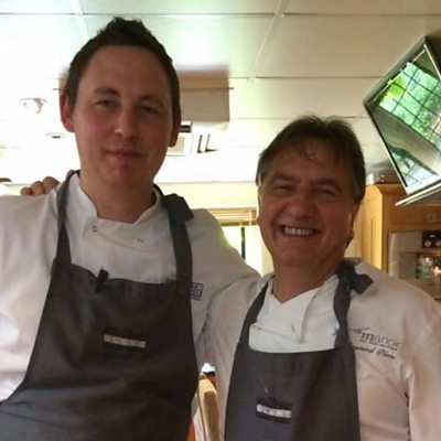 Geraint Lloyd yn sgwrsio gyda Michael John o Ysgol Goginio Raymond Blanc - Le Manoir.