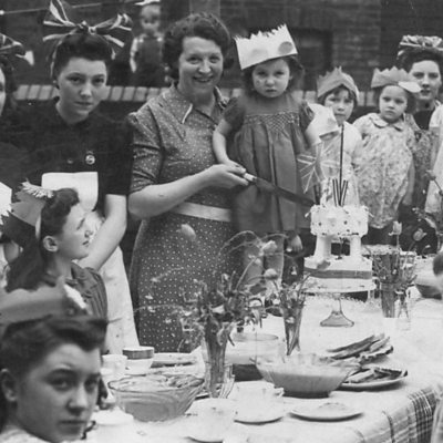 There were all kinds of street parties in Sheffield to celebrate VE Day. A photograph survives of a big celebration in Brightside. It shows a two-year-old standing in pride of place on a long table laden with food. She is holding a knife next to a layer cake. That little girl, now 72-year-old Val Stokes, spent most of the war without her father who was away in North Africa when she was born. She didn't meet him until she was three. Val thinks the party would have been organised by her mother who ran the local corner shop and was able to barter various items to get hold of enough sugar coupons to make the cake. Val shared a family photograph with BBC Radio Sheffield's Kate Linderholm that tells a very personal story from a day of national significance. Image: A VE Day street party