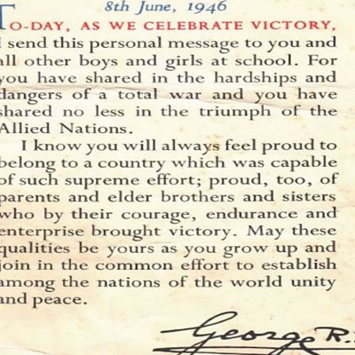 Jan Tribe was eight and a half years old when she remembers listening to Sir Winston Churchill’s victory speech on the radio. Jan says she always remembers her mother throwing up her arms in elation saying: “The war is over, the war is over, we might get Uncle back!” Jan lived in Woodside Street, Cinderford in the Forest of Dean where they celebrated VE Day with a street party. The street was decorated with red, white and blue bunting. Trestle tables with paper table cloths were brought out and the men lifted Mrs Hedge’s piano out where she played songs such as Roll out the Barrel, I’m Yours and We’ll Meet Again. It was a close community with all the mothers helping out to provide food for the party. Jan’s next door neighbour made a milk jelly which consisted of a whisked jelly with evaporated milk; all the children loved it. There were fish paste sandwiches, sardines and home baking with Jan’s grandparents providing the eggs. Each Saturday morning Jan went and queued up at the bakery to get two loaves of bread and a dozen dainties (rock cakes). The weather on VE Day in Cinderford was warm, with blue skies. Jan remembers wearing a short sleeve dress. The men drank pints of beer with the women on port and lemon. Mr Rook organised races in the street. Jan being very competitive enjoyed racing, skipping and having a three legged race. Other streets in the area that also celebrated with a street party included Pembroke Street, Belle Vue Road and Flaxley Street. Jan remembers the celebrations being a fantastic and exciting time, but she also remembers it was tinged with sorrow. Sadly, Jan’s uncle who was serving in the RAF was missing when victory in Europe was declared. After the war he was presumed dead. At school, Jan and all other school children were given a commemorative personal message from King George VI to celebrate victory. Image: Jan’s personal message from King George VI