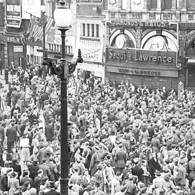 The announcement of victory in Europe meant a day off work and a celebratory trip to London for 16-year-old Jack Stanford. Too young to serve in the army, he was living in Chalfont St Peter and working for a builder at the time. His uncle, who had been a sailor during the First World War, took him to London and they explored the sights, enjoying the chaos and atmosphere of the day’s celebrations with the crowds that had gathered. Jack joined the army after the war, when he was seventeen and later served as a police officer for more than twenty six years. He now lives in Reading. Image: Piccadilly Circus Interview with Jack Stanford by Janice Hunter
