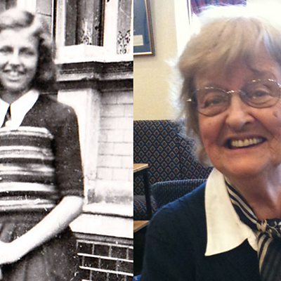 Ruth Tucker is in her eighties now, living in Melton Mowbray in Leicestershire. She’s a widow who met her English husband during the post war days of the Berlin Airlift. But on VE Day , Ruth was 14-years-old and on the run from Stalin’s Red Army. Her father had been killed during the Battle of Stalingrad, and shortly afterwards, she and her mother lost their home and all their possessions. Ruth was sent away to live with an aunt in the countryside while her mother worked as a telephonist for the German army. In the month before VE Day, Ruth’s mother came to pick her up; arriving on a large truck full of German officers who were deserting their posts before the Russian army arrived in Berlin. After a frightening journey with hardly any food, Ruth and her mother were dropped in Lubeck. The centre was deserted, as the English army were about to arrive. That’s when Ruth knew the war was over….. Image: Ruth then, and now