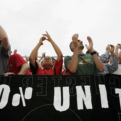 Fans of Manchester United, angry at the Glazer family who own the club, set up their own club called FC United. It's taken football back to its roots - a long way away from the huge stadiums, big star names and massive salaries of the English Premier League. Ten years on, how is FC United doing? Sports reporter Alex Capstick has been finding out. (Photo: FC United fans. Credit: Ian Walton/Getty Images)