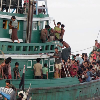 Last week hundreds of migrants from Myanmar and Bangladesh were rescued by fishermen. They are being held at a temporary camp in the Indonesian port of Langsa. Our correspondent, Martin Patience, has been speaking to some of the survivors. (Picture: Migrants sit on their boat off Indonesia as they wait to be rescued / Credit: AP)