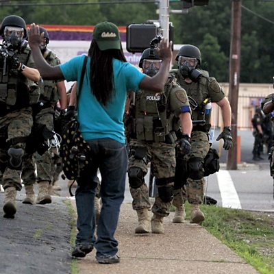 Former cop Seth Stoughton is now professor of law at the University of South Carolina. He explains how police training encourages the use of deadly force. Photo: Police wearing riot gear walk toward a man with his hands raised in Ferguson (Credit: AP Photo/Jeff Roberson)