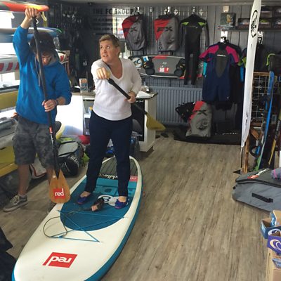 Shelley Jory-Leigh learns about standup paddleboarding from Gary Willingham