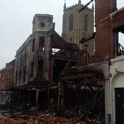 Fire in Fakenham market place reduced shops and flats to a charred and ruined shell, Jill Bennett reports.