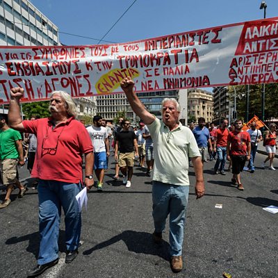 All eyes are on the Greek Parliament where politicians will decide whether or not to pass the tough austerity measures which creditors have demanded as the price of an 86 billion Euro bailout. One Syriza MP has already announced she's quitting ahead of the vote, a vote which comes as the IMF has criticised the reforms for being unrealistic. We gauge the reaction in Greece with our reporter Tony Bonsignore who's in Athens. Even if the bailout for Greece is approved by the parliament in Athens, significant hurdles remain - not least a vote in the German parliament at the end of this week. We hear from Stephan Bayer, an MP from the CSU party, which forms part of Angela Merkel's government. Also on the programme, for the first time in 80 years, foreign firms are being invited to buy a stake in Mexico's vast energy reserves. Our correspondent in Mexico City, Juan Paulliere, tells us more. (Picture: Protesters chant slogans during a protest in central Athens Credit: AFP/Getty)