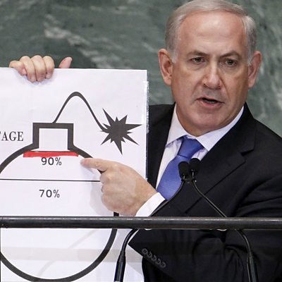 Have we lost our fear of the bomb? And, how successful have efforts been to limit its spread? Seventy years ago, the very first nuclear weapon was detonated by the US army in the deserts of New Mexico. Since then, diplomats and politicians have sought to strictly limit the number of nations capable of following suit – and after years of tortuous negotiation a deal has finally been reached to limit Iran’s ability to construct its own bomb. So what is the state of the nuclear threat today? Join Owen Bennett Jones and his distinguished panel of experts, including former nuclear inspector Hans Blix and former British Foreign Secretary Jack Straw as they discuss how safe the world now is from nuclear catastrophe. (Photo: Israeli Prime Minister Benjamin Netanyahu holds up a graphic of a bomb. Credit: Reuters)