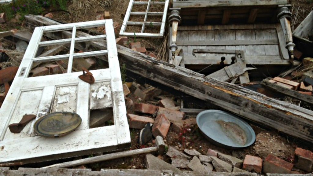 Den visits a mock-up of an obliterated French village, typical of WW1-era France.