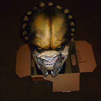 Landscape gardener Joe Whiteman chats to BBC Radio Hereford and Worcester's Pam Caulfield about his homemade and self-designed 7.5ft papier mache model of the alien from Predator.