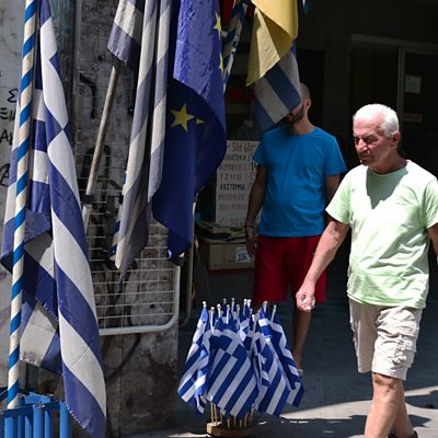 Greece has agreed a third bailout package "in principle" with its international creditors. The deal now needs to be approved by other eurozone countries. The Greek government, which has committed to implementing new austerity measures, hopes to push the new $95bn agreement through parliament later this week. China's central bank has devalued the country's currency, the yuan, to its lowest rate against the US dollar in almost three years. At the weekend China reported a sharp fall in exports and this latest move should make Chinese goods more competitive and boost growth. But we talk to one economist who says there's more to the devaluation than simply stimulating the economy. Plus, it is enough to make you cry - the price of onions in India is hitting eye-watering levels, and that is worrying for many consumers because the vegetable is such a staple ingredient in Indian dishes. But, as the BBC's Rahul Tandon reports, the soaring prices are also a big concern for the country's politicians. Picture: Greek Flags for Sale in Athens; Picture credit: Getty Images
