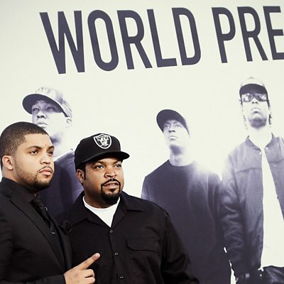 Straight Outta Compton, the much-awaited biopic of the LA gangsta rap group NWA, has had its world premiere in Los Angeles. NWA were pioneers of a raw, confrontational rap style that chronicled the lives of young black men in inner-city LA. Rap music historian Ben Westhoff explains the group's influence on pop culture. (Photo: Rapper Ice Cube of NWA together with his son O'Shea Jackson Junior, who plays him in the film Straight Outta Compton. Credit: Jason Kempin/Getty Images)