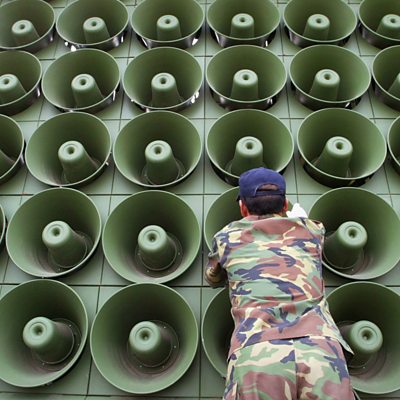American radio journalist Chance Dorland explains how South Koreans are taking North Korea's war threats. (Picture: South Korean soldier takes down propaganda loudspeakers on the border with North Korea/ Credits: Chung Sung-Jun/Getty Images)