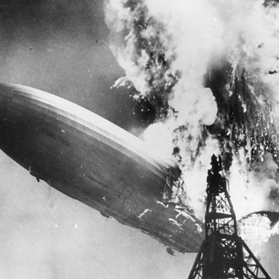 The famous recording by American broadcaster Herbert Morrison, working for the Chicago radio station WLS (the 'Prairie Farmer Station'). He describes the moment the German passenger airship LZ 129 Hindenburg burst into flames and crashed to earth, with the loss of 36 lives on May 6, 1937. It was broadcast the next day. (Photo: The Hindenburg disaster at Lakehurst, New Jersey) (Credit: Sam Shere/Getty Images)
