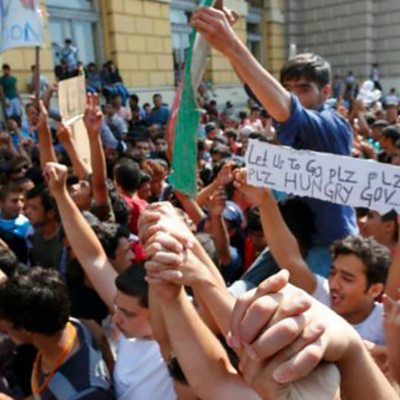 Should the UK take its fair share of migrants? Ntaganda ICC trial starts; embassy's plan to evict Assange (Photo: Migrants hold hands and hold banners that read 'Let us go plz'. Credit: Reuters)