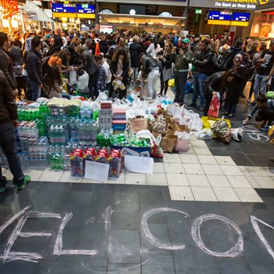 Thousands of migrants greeted in Germany; Coalition deaths in Yemen; A special trombonist (Photo: AFP)