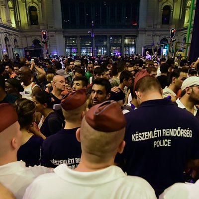 Hundreds of migrants who have been protesting outside a major railway station in the Hungarian capital after police sealed off the terminal to stop them travelling through the EU. Philipp Seitz, from the Mittelbayerische Zeitung newspaper, was at the scene. (Picture: migrants stand in the Eastern railway station of Budapest behind of a line of the local police. Credits: Attila Kisbenedek/AFP/Getty Images)