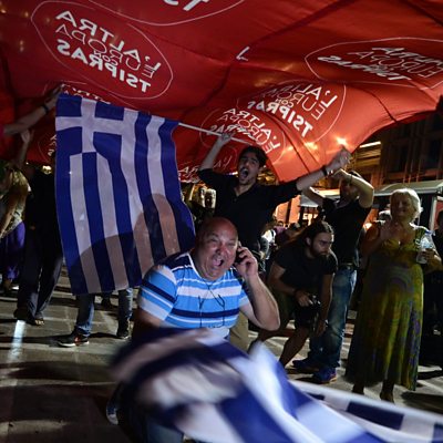 Alexis Tsipras claims victory as Syriza wins Greek elections, but his party falls short of an overall majority; Republican presidential hopeful Ben Carson says Islam is inconsistent with the US constitution; When Francis met Fidel: the Pope meets Cuba's former revolutionary leader Fidel Castro. (Photo: :Syriza's supporters celebrate with flags their party's victory after the general election in Athens on September 20, 2015) (Credit: LOUISA GOULIAMAKI/AFP/Getty Images)